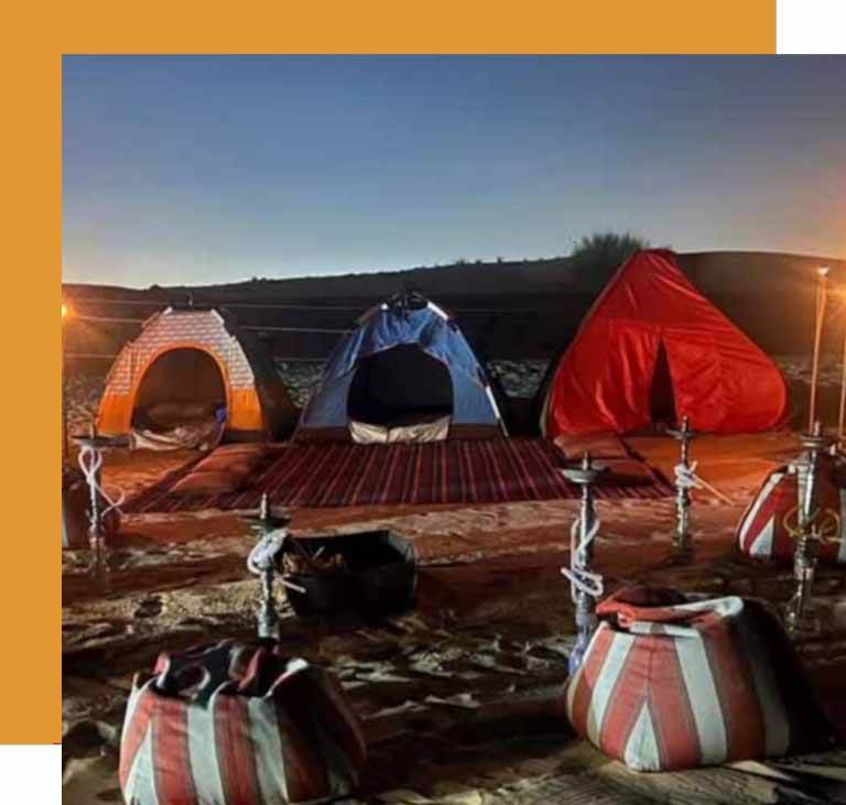 We operate each desert safari with a land cruiser which is full with secure role cage, bucket seats and a full safety features to give you a comfort feel and safe journey. A sunset will lead you towards your campsite. At camp you will enjoy awesome natural desert campsite looks good in evening.